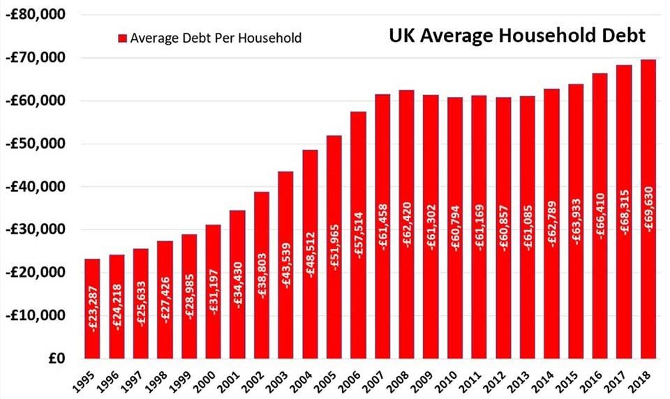 Back in 1995 the average family had borrowings of just over £23,000. Come 2018 it was just under £70,000. That’s a pretty significant increase, particularly at a time when our rate of ecomonic growth hasn’t been great and inflation’s been under control. But there are two sides to the story. When you borrowed your mortgage you bought a house, so you had a debt and an asset. There are two sides to the balance sheet. If we take the other side of the balance sheet into account and you look at assets:
