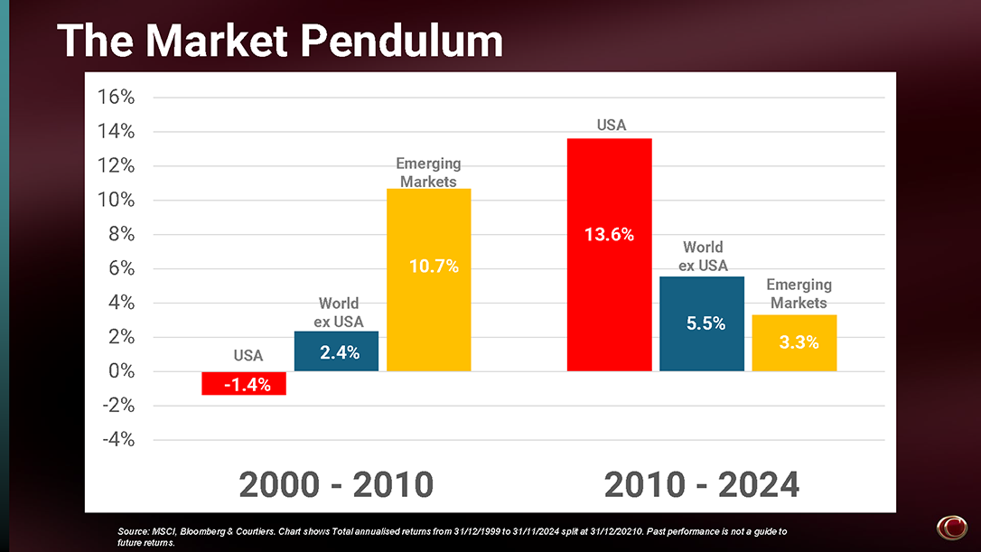 We’ve spoken about how the Magnificent Seven have acted as a pendulum on the market in a few previous articles, whether listening to Gary explain it here and another on how we are looking to small caps to limit our S&P 500 Magnificent Seven exposure. This seminar though, the conversation expanded to explain that while the US, Taiwan and India are running high, “Everything else is at a discount” and “being prudent pays”.