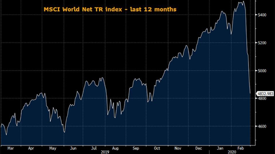 As the chart shows, last week’s rout has erased the gains made by global equity markets since last October. Stocks declined in all industries, although some sectors were more heavily affected than others. In the FTSE 100 index, which lost nearly 11% during the week, one of the worst performing sectors was Consumer Discretionary. Many of the companies in this sector would struggle if the outbreak were to spread considerably, as fewer people would be going out to restaurants, cinemas and gyms etc. The VIX index, which measures implied volatility within the US equity market, reached its highest level since 2008.