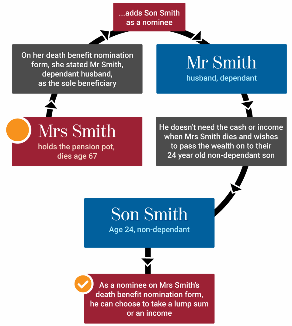A nominee is any individual (i.e. not a trust, charity or company) that you choose to elect, who is not a dependant. The nominee can elect to receive an income from the pension instead of a lump sum.