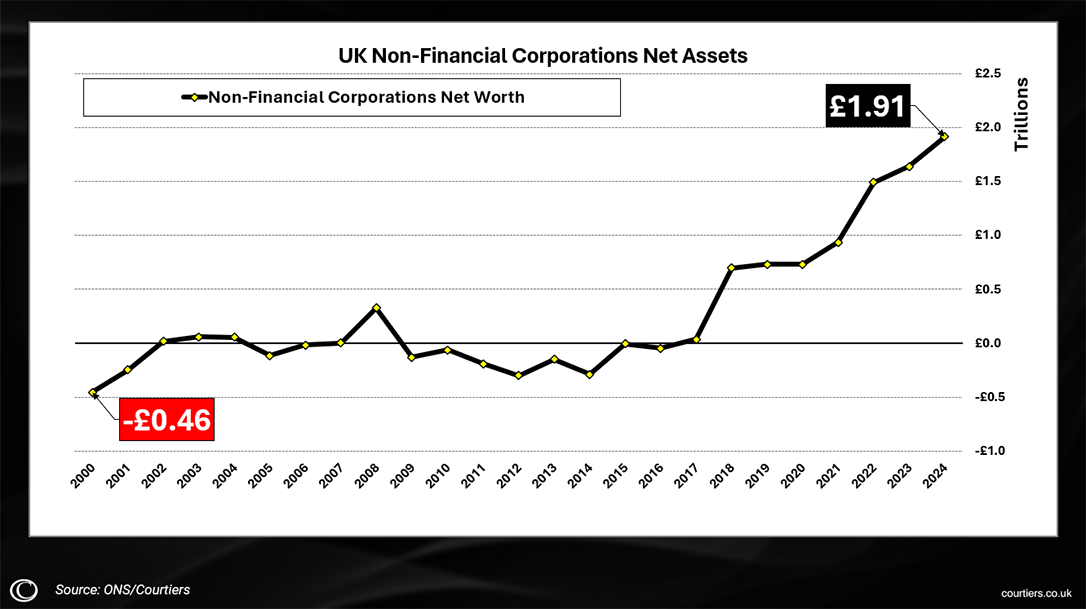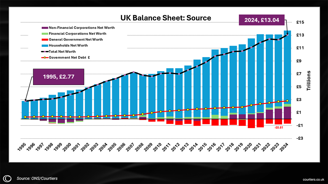 The collective balance sheet of the UK shows that households have been building its net worth, the red and yellow line is the government debt. However, if you combine all the figures, you get the key figure at the top – 13 trillion. “Not such a bad position to be in,” says Gary.