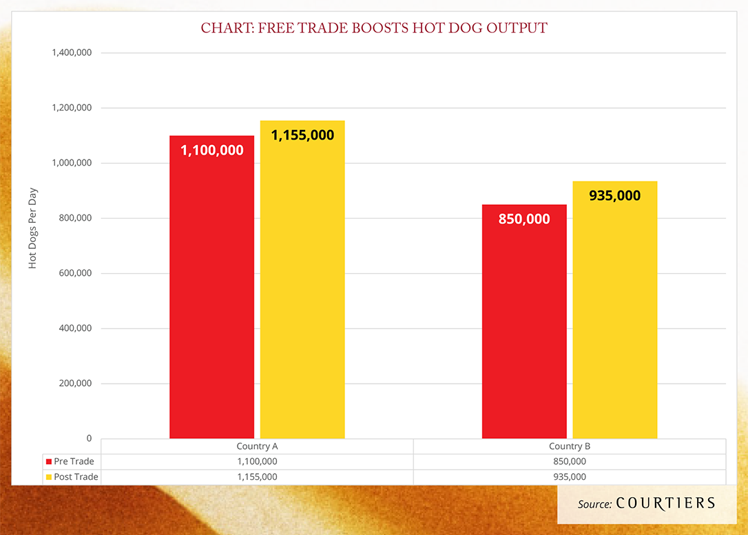 If you do the maths, you find that, post trade, Country A has 1.155 million hot dogs per day to consume, and Country B, 935,000. As if by magic, Country A is better off in hot dogs by 55,000 (5%) per day and Country B by 85,000 (10%) per day.
