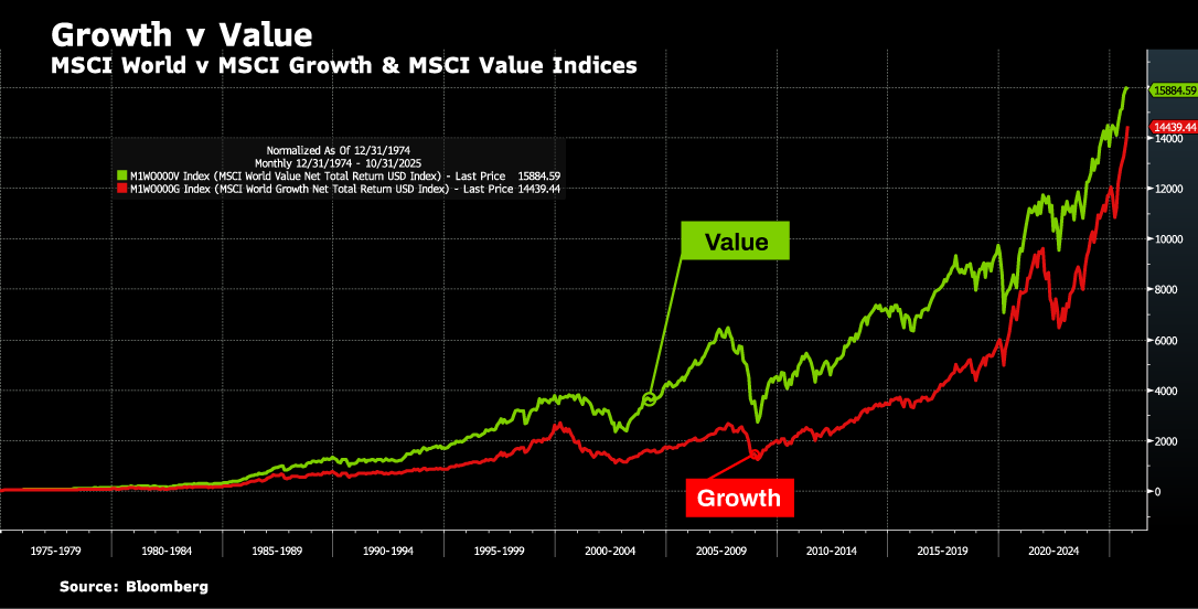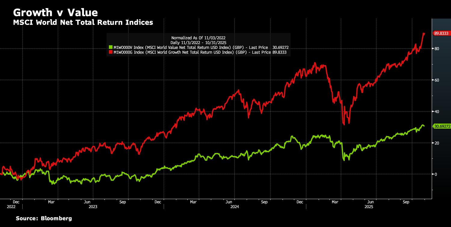 There remains a gap in performance between Value and Growth which, whilst not as exaggerated as in recent years, has nonetheless persisted through 2025, with the MSCI World Value Index returning 10.89% year to date, compared to 17.09% from the MSCI World Growth Index (both in GBP terms, i.e. this is what sterling-based UK investors would have received up to 31st October 2025).