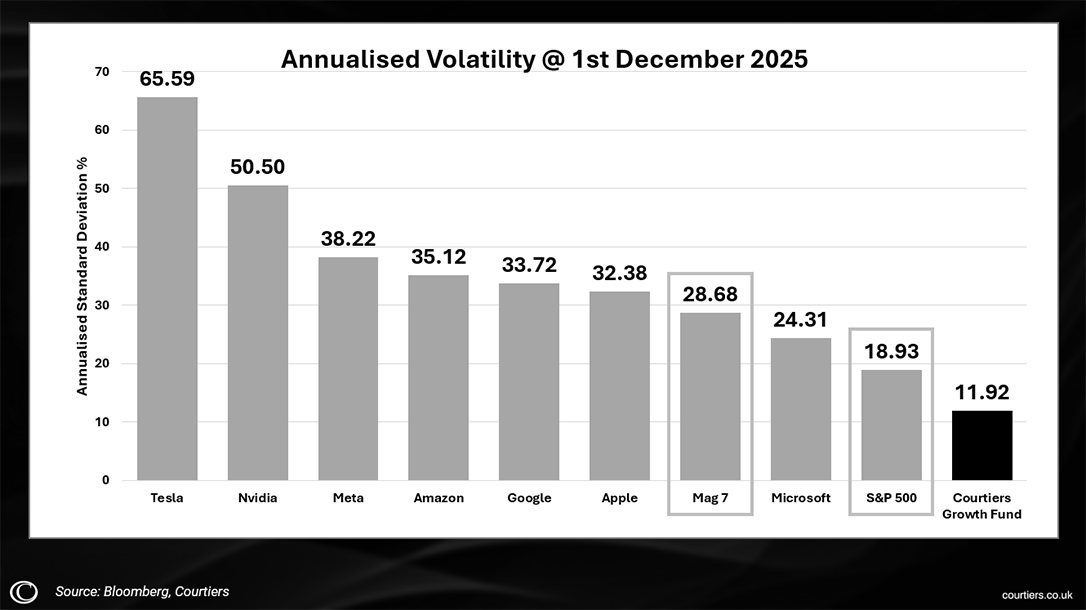 The chart shows annualised volatility of the Mag 7 at 26.68% and the S&P 500 at 18.93%, while the Growth fund came in at 11.92%. You can see some of the companies in the Mag 7 hit whopping levels of volatility this year – 65.59% for Tesla and 50.50% for Nvidia.
